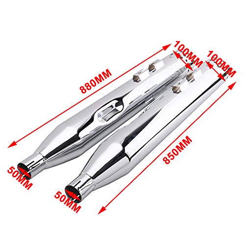 31 inch lang, 1-3/4 inch inlaat/4 inch uitlaat. Enorme 4″ uitlaten op 4″ dempers met chromen Tapered Tip voor een uitstekende look
